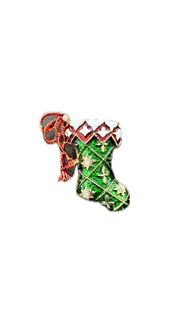 Pirinç üzerine altın kaplama, mine ile renklendirilmiş, parlak taşlı, iğne kapamalı broş.
